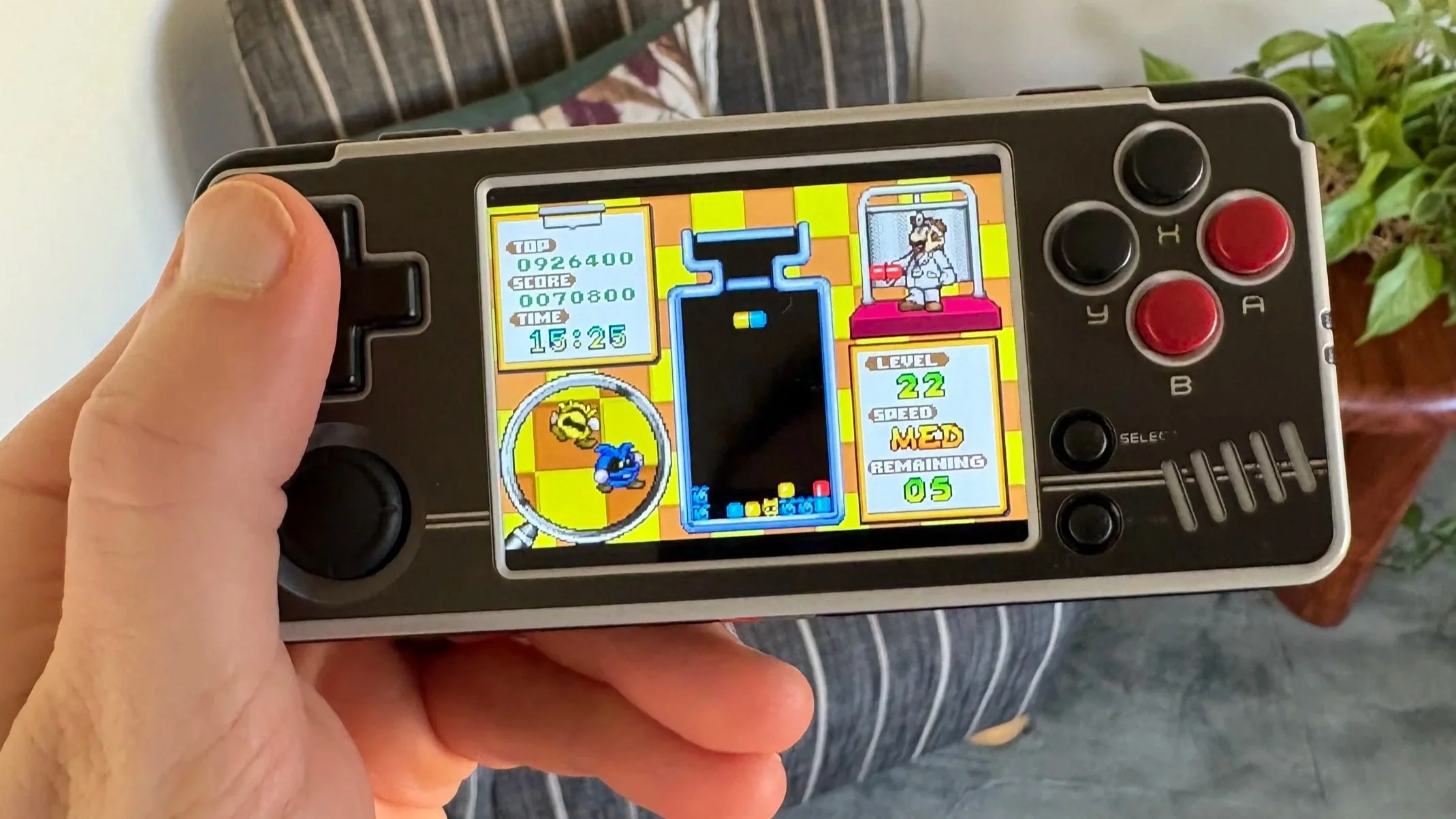 There was another aspect of the MIYOO A30 that I found particularly appealing. Much like the PocketGo before it, the overall form-factor of the A30 is very similar to Game Boy Micro. (So I somehow failed to mention the Micro anywhere in my PocketGo review, which feels like a big oversight.) The Micro was the smallest, most pocketable Game Boy Nintendo ever made. Most importantly for me, it’s probably the most convenient way to carry around Dr. Mario with you wherever you go.