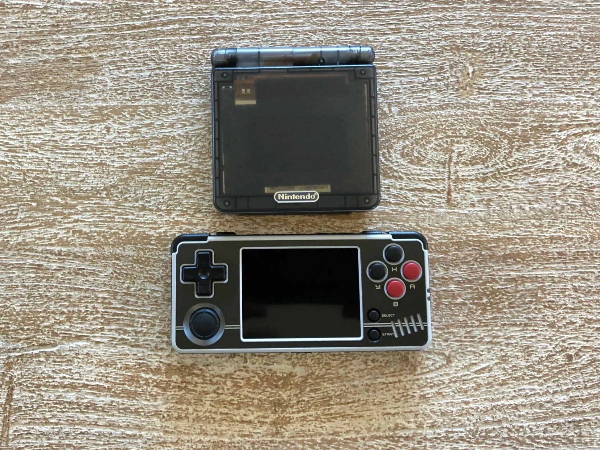 Size comparison: MIYOO A3O versus Game Boy Advance SP (closed)